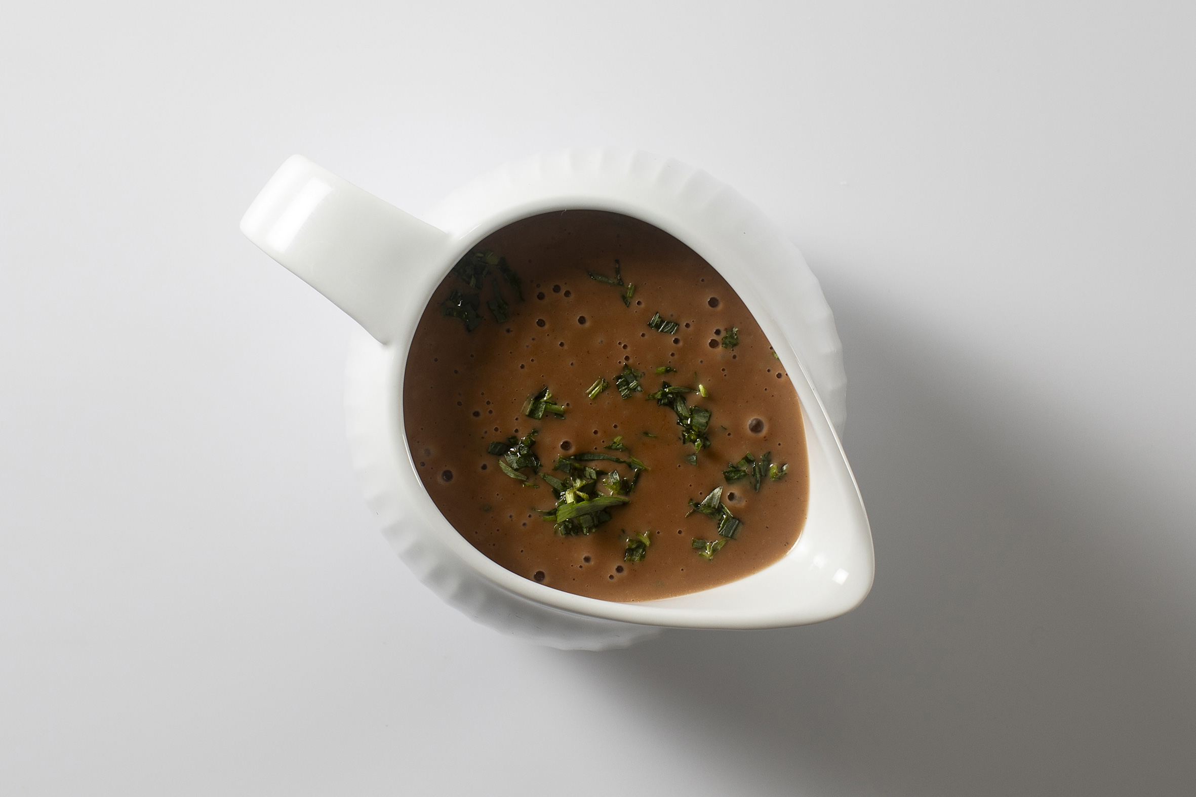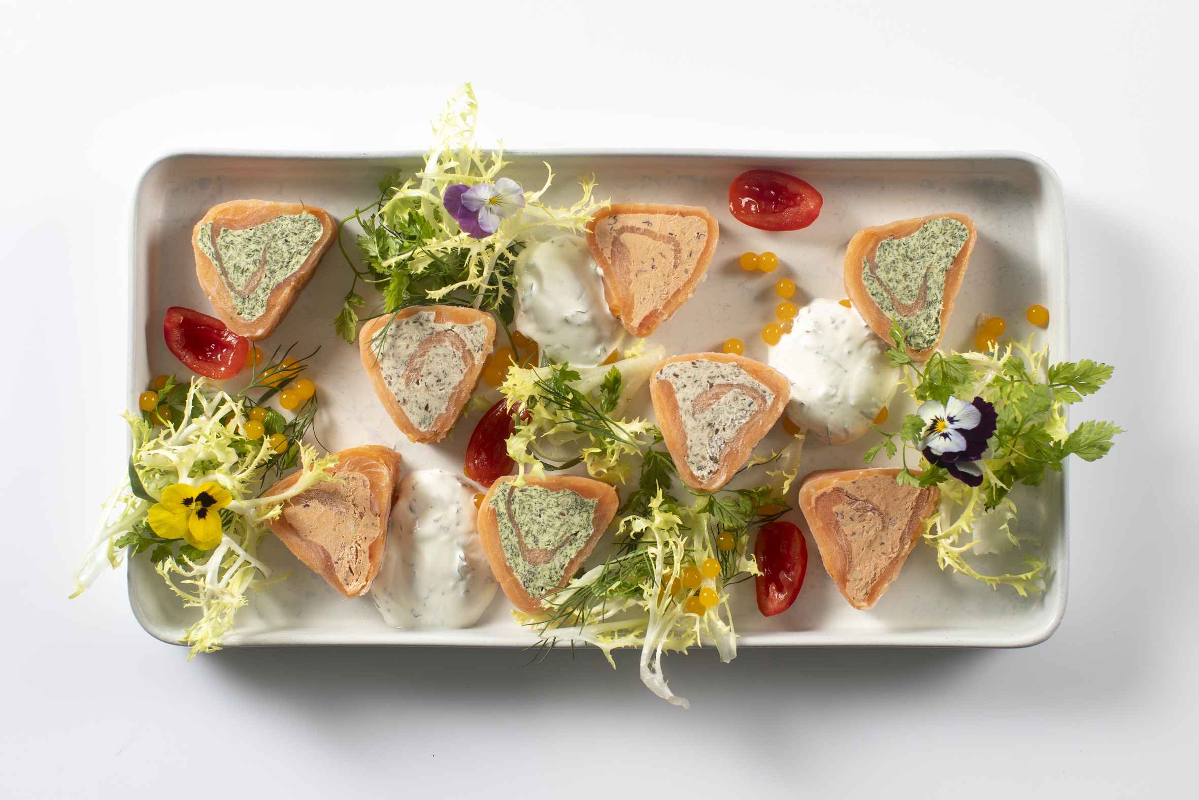 • Lakseterrine med ramsløgsdressing og krydderurtesalat.