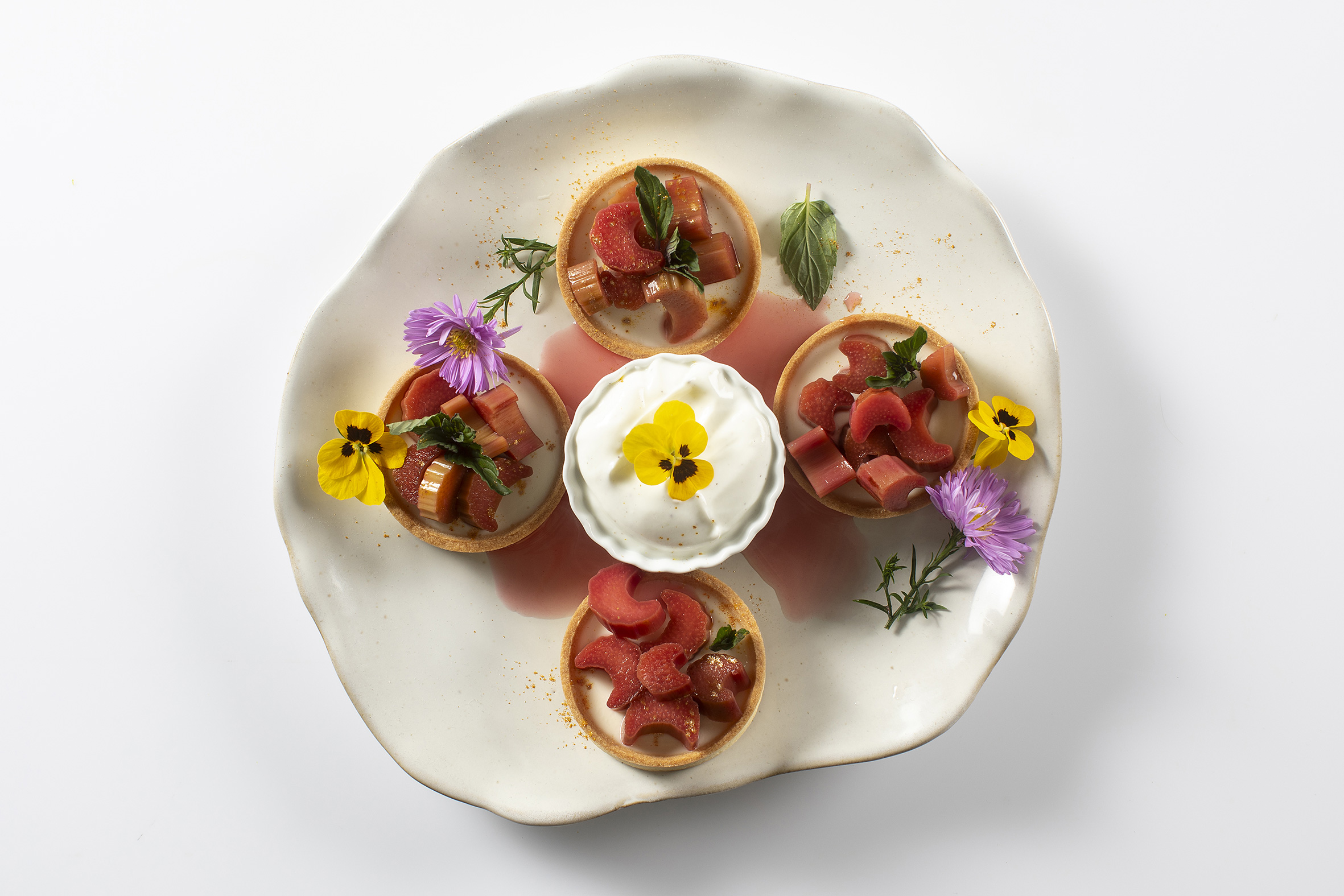 • Rabarbertærte med vaniljecreme og syltede rabarber. (Tilkøb)