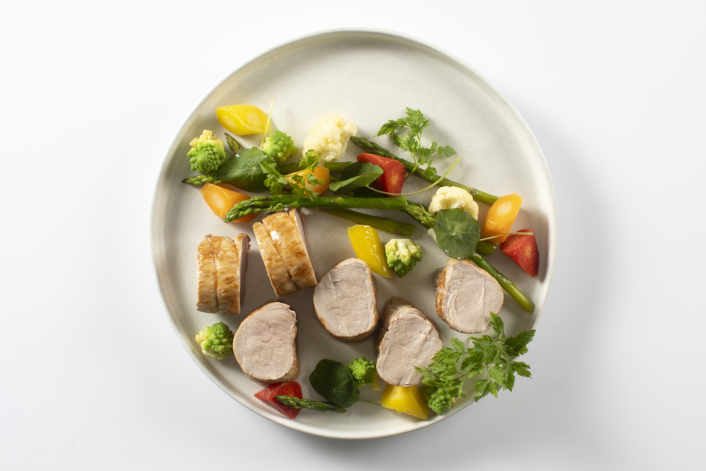 - Mørbrad Royal af gris med petit grøntsager.