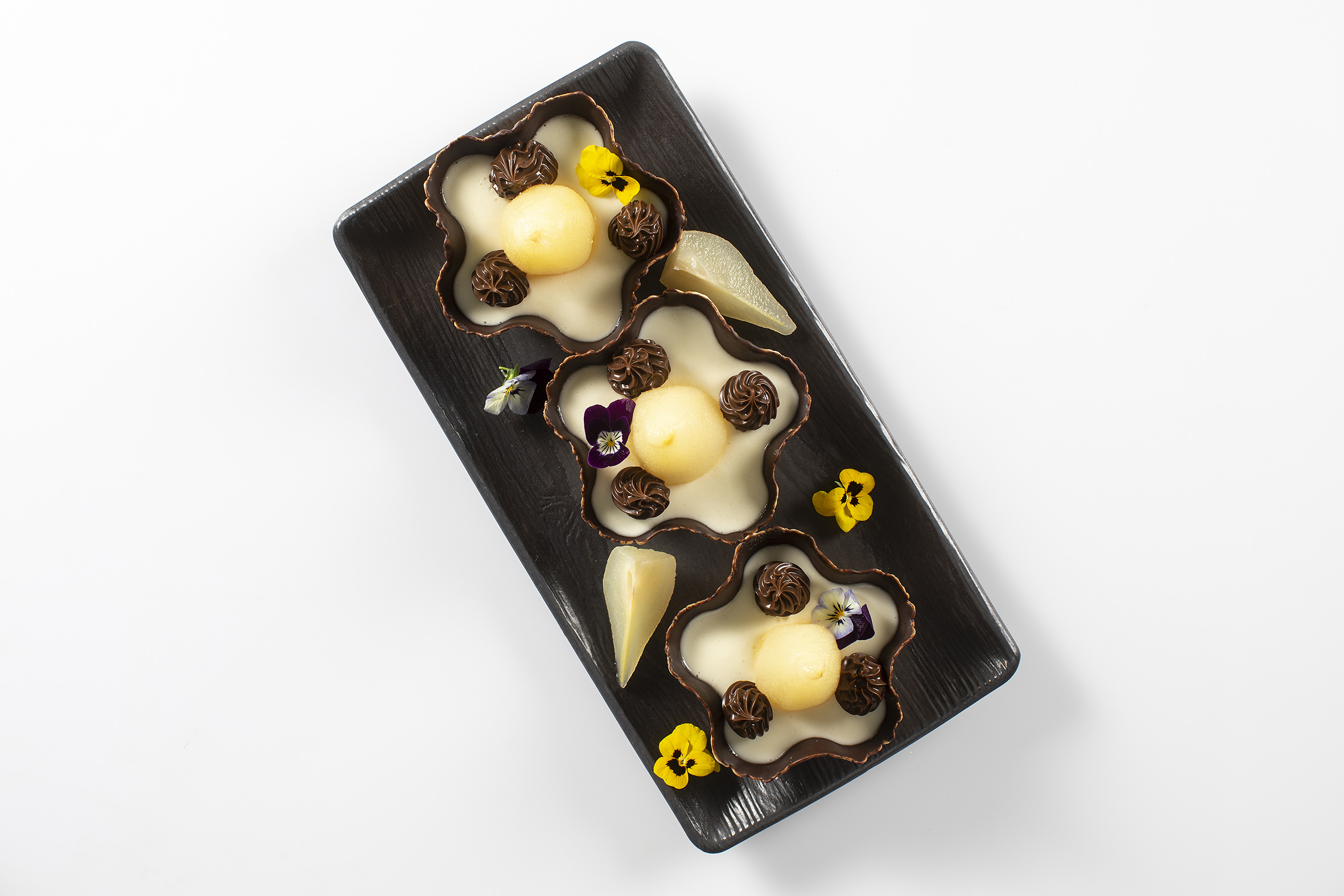• Pære Belle Helene, syltede pære og panna cotta creme i chokoladeskal. (Tilkøb)